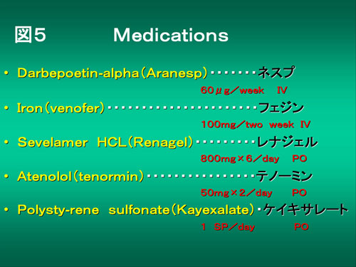 (図2)2)ウイルス感染症の有無では、HIV、 HCV、HBs とも陰性であった。(図3)3)透析 条件では、左前腕のA − V fissura を使用し、 1 回4 時間で週4 〜 5 回の血液透析を施行して いた。ヘパリン等の抗凝固剤は使用せず、血液 流量300ml/min、透析液流量500ml/min で、 目標体重は84kg となっていた。透析器(ダイ アライザー)は、フランス国産のブランドを使 用していた。(図4)4)薬物処方では日本と同 様、通常の透析患者用の処方であった。(図5)