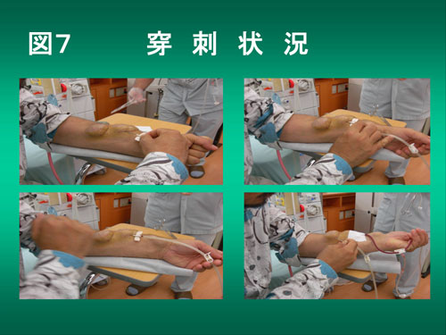 以上、日本とフランスの透析条件を比較する と、フランスでは特殊加工のヘパリンコーティングメンブランの透析器(ダイアライザー)を 使用し、無ヘパリンの下、自己穿刺で家庭透析 を施行していた。(図6)尚、当院での臨床検 査所見では、通常の血球計算機で血小板は 5,000 であった。(表7)