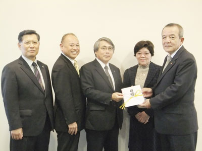 この度、平成22 年度の募金がまとまりまし たので、去る2 月28 日(月)に下記のとおり 沖縄県交通遺児育成会へ贈呈いたしました。