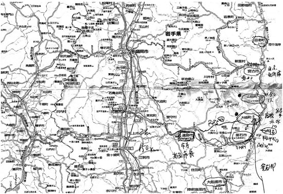 Fig.4 岩手医科大学でのレクチャーで配布された地図とその時のメモ。これをもとに遠野市経由で大槌町を目指す。