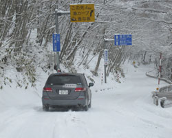 ○ 14 時20 分 遠野市を出発。35 号線の途中 まで遠野市が先導車を出して下さる。山越えの 道では吹雪と積雪となる(Fig.6)。