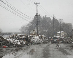 3 月19 日(土) 雪も溶けて晴れた朝をむか える。町の中心道路の瓦礫の撤去も進む。携帯 電話の電波を求めて町に降りる。津波と火災の 威力を目の当たりにする(Fig.18,19)