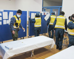 ○ 17 時00 分 吹雪く中、城山公園内の大槌町 中央公民館にある災害対策本部に到着。隣接す る避難所となっている城山体育館内トレーニン グルームに仮設診療所を設置することとなる (Fig.8)。