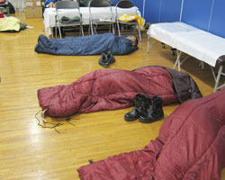 Fig.10 仮設診療所で寝袋に入り就寝。