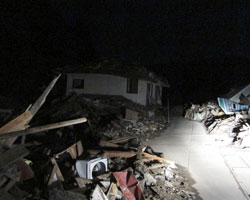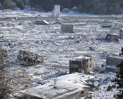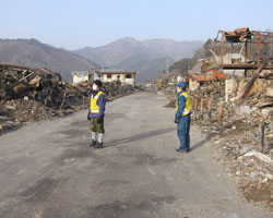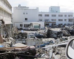 ○ 16 時05 分 生きた心地のしない山越えが終 わり、やっと太平洋沿岸の鵜住居町へ出る。辺 りには津波の爪痕が広がる(Fig.7)。