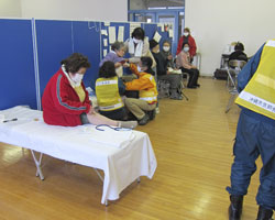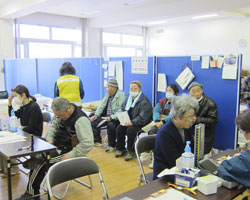 ○ 8 時30 分 9 時の開始を待たずに診療開始。 トレーニングルーム入り口の廊下に多くの方々が列ばれる(Fig.12)。保健師さんと診療につ いて協議、患者数が全く未知のためにまずは1日処方、血圧は160/or/110 以上を投薬対象、 緑内障は診療所に来て頂き点眼することとして診療開始。ほとんどの方が被災前に服用されていた薬を流されたとのことで受診(Fig.13)。