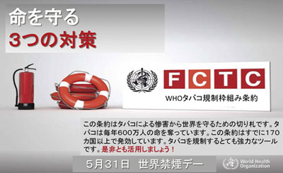 今年の世界禁煙デーのキャンペーンのキー・ メッセージは、「全て締約国は、タバコ消費と 受動喫煙による健康、社会、環境、および経済 的な壊滅的被害から、現在と将来の世代を保護 するため、この条約を完全に実施しなければな らない」というものです。FCTC がタバコとの 戦いに有効であることは既に証明されています が、日本は2004 年6 月に批准した締約国であ りながら、第14 条の禁煙治療以外には誠実に 履行しているとはとても言えない状況です。タ バコのない社会の形成に向け、医師個人とし て、また医師会として活動できることを実践 し、疾病・健康の専門家として地域社会や国に も積極的に働きかけていきましょう。