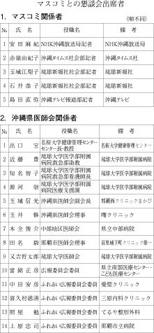 5 月20 日那覇市医師会館において第1 回マス コミとの懇談会が開催されました。今回は去っ た3 月11 日に発生した東日本大震災に対して沖 縄県医師会が3 月15 日から派遣した医療支援 の報告を行いました。今回、第1 陣として雪の 中を四輪駆動車に乗って現地に入った名桜大学 健康管理センターセンター長の出口宝教授によ る詳細な報告により、この災害医療派遣がいか に困難の連続であったかがよく理解できました。 災害派遣は日常の出来事ではなく、危険回避の ために万全を尽くしつつも、危険と隣り合わせ の非常に過酷な任務でありました。また、同時 期に現地に入った琉球大学医学部附属病院救急 部看護師長の知名智子さんの報告は看護師の目 を通し、避難所の衛生環境が非常に過酷な状況 であったこと。また、その中で人々が助け合い、 いたわり合って生活する様子が報告され、とて も感動しました。テレビなどで報道される炊き 出しや、温かいご飯、ゆっくり暖まるお風呂の ありがたさが実感として伝わって来ます。大き な自然災害において人の力はあまりに無力に感 じられてしまうこの大震災ですが、人がその優 しさを持ち寄れば、どれほどの破壊からも必ず また立ち上がれるのだと確信致しました。