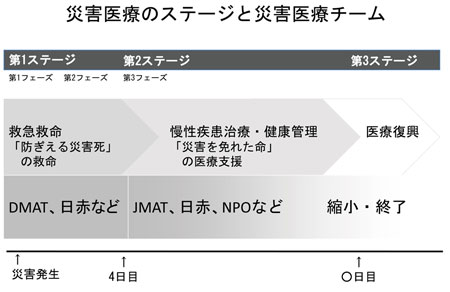 災害医療は発生してから経時的に分類されて います。いくつかの分類があるようですが、一 般的に超急性期から急性期、亜急性期から慢性 期、慢性期から復興期の3 つのステージに分け るとスライドのようになると思われます。ステ ージ1 では「防ぎえた災害死」の救命で発生か ら3 日目まで、ステージ2 では「災害を免れた命」の医療支援となります。発生から4 日目か らはじまり災害関連疾患、慢性疾患治療、衛生 管理、健康管理など二次災害予防を行うことと なります。そして復興期となり、医療支援から 医療復興支援へと移行していきます。