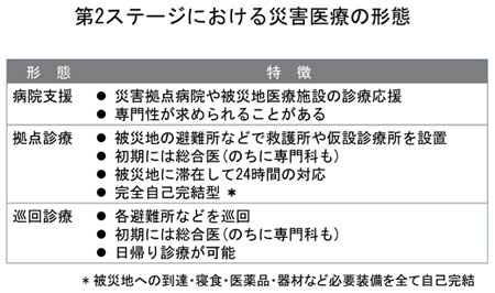 次に、第2 ステージ災害医療の形態について ですが、病院支援、拠点診療、巡回診療があり ます。それぞれスライドのようになります。