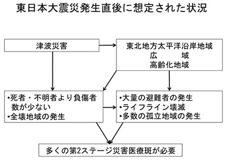 東北地方太平洋岸で大津波による広域災害が 発生しました。まず、津波であるため地震に比べて負傷者は少ない、多くの地域が壊滅し孤 立、そこに多くの避難者の方々がおられると考 えました。