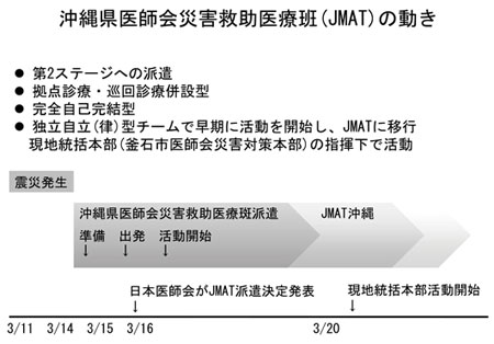 そこで、すでに被災地ではステージ2 の医療 支援が必要とされていると考え、どこからの要 請や指示も待たずに独自の判断で完全完結型の 自律した医療支援チームの派遣を3 月14 日に決 定して翌15 日には出発しました。決定後すぐ に出発できたのは医師会事務局が一丸となって 準備して頂いたおかげです。日本医師会が JMAT の派遣要請した時点で我々は現地で JMAT 沖縄となり、釜石医師会対策本部が立ち 上がってからは、その指揮下に入りました。