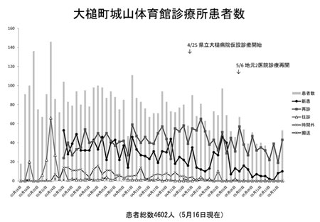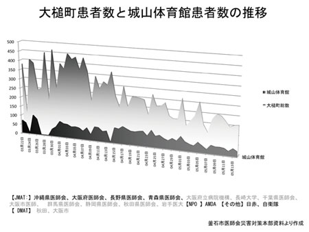 次に、現時点での城山体育館仮設診療所の診 療状況です。そして大槌町全体の患者さんの数 と城山での患者さんの数です。このスライドを 見まして、いくつかのチームが大槌町で活動し ているなか、沖縄県医師会はある一定の役割は 果たしていると思います。