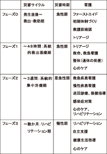 医療支援活動地は、岩手医 科大学対策本部で日常生活と 医療上の問題について説明を 受け、大槌町での医療支援に 決まりました。私たちの活動 は、災害から6 日目災害サイ クルフェーズ2 の段階で、救 急疾患看護や慢性疾患看護、 巡回診療、保健指導、感染症 対策、心のケアなどの看護を 行う段階で、医薬品以外に必 要品を全部持参した自己完結 型で行いました。
