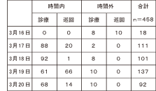 診療患者数は、直接来院者と保健師からの 依頼で巡回診療を行い、5 日間で合計458 人で した。