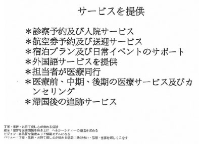 サービスの手順としては、依頼者より連絡を受 けて24 時間以内に担当者から返答を行い、依頼 者の病状等を把握したうえで計画書を作成し、治 療費を含め納得した時点で契約が成立する。な お、航空券や宿泊など滞在中の全てのケアを行っ ており、帰国後の追跡サービスも行っている。
