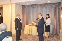 沖縄県医師会代議員会議長新垣善一先生から 当選証書を受け取った宮城信雄会長は挨拶の中 で、役員を退任された小渡敬先生、大山朝賢先 生、當銘正彦先生、稲福豊先生に対し、これま での労を労う感謝の言葉を述べると共に、新執 行部並びに名嘉村博医学会長、田名毅医学会副 会長と共に、地域に根ざした活力ある医師会を 目指し、今後より一層頑張っていきたいとの決 意を述べました。