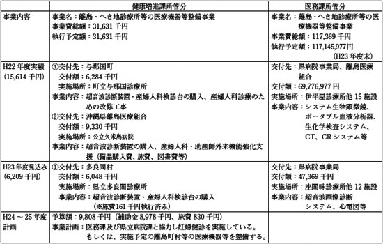 平成23 年12 月26 日に厚生労働省に進捗状 況を報告したが、沖縄県の平成23 年度末の執 行予定額は25 億714 万7 千円(宮古・八重山 6 億7,258 万8 千円、北部18 億3,455 万9 千円) で、執行率は50.1%(全国の執行率35.7%) となっている。