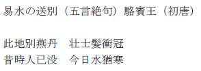 <読み方>此の地燕の丹にわかれる。壮士の髪 冠をつく、せきじひとすでに没し、こんにち水 なおさむし。