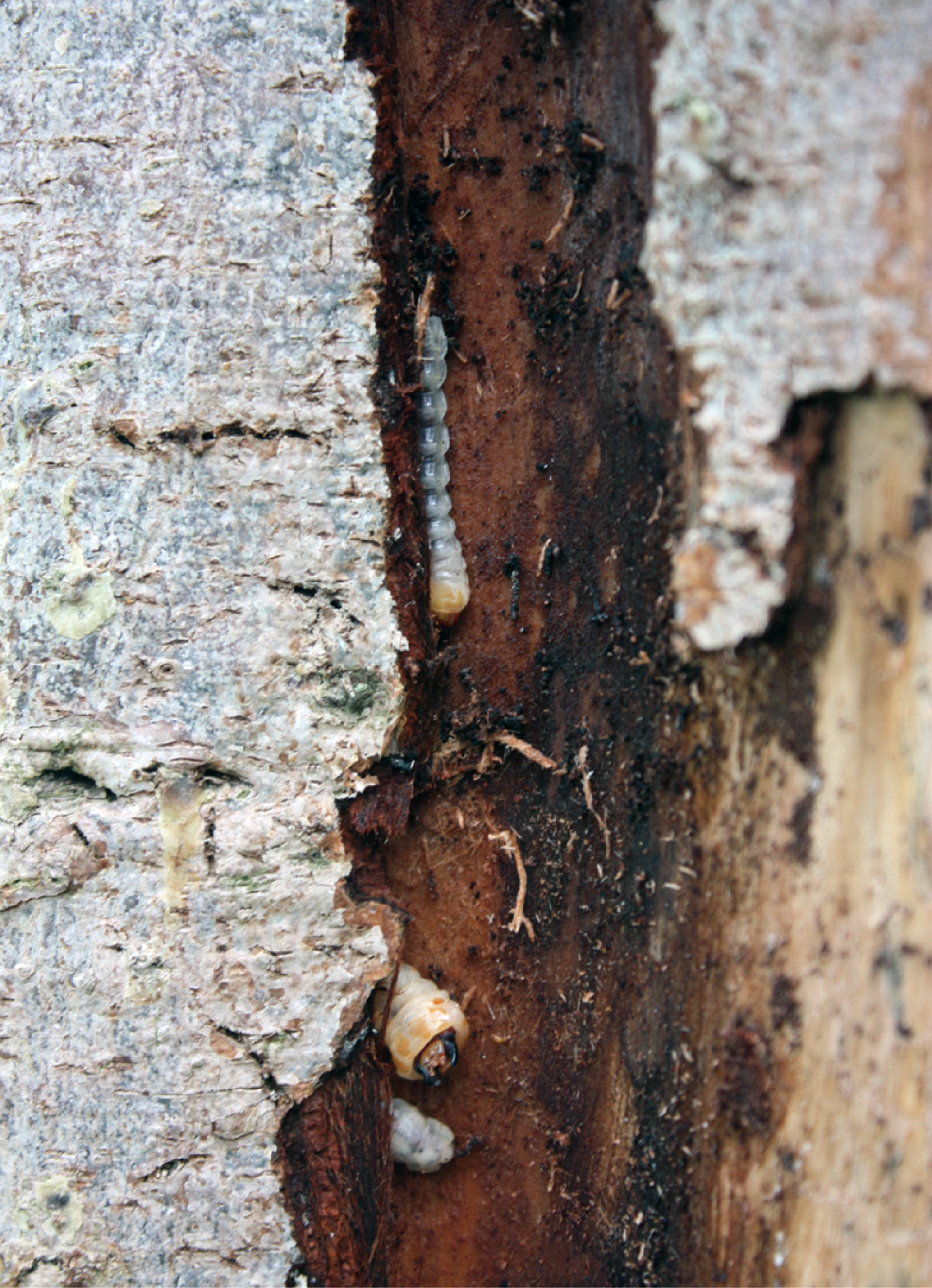 ところが、枯れかかった菩提樹の樹皮をはが したところ、樹皮の下に数ミリから数センチま で、大きさが異なるゴマダラカミキリの幼虫が 沢山出てきた(写真6,7)。樹根の樹皮下にもいる。