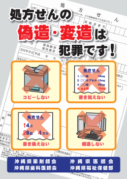 このたび、沖縄県薬剤師会が、この様な不正な処方箋偽造による不正入手が刑法違反であるというポスターを作成し、各医療機関への配布をお願いし、併せて新聞各社に対し県民への注意喚起をお願いする事と致しました。