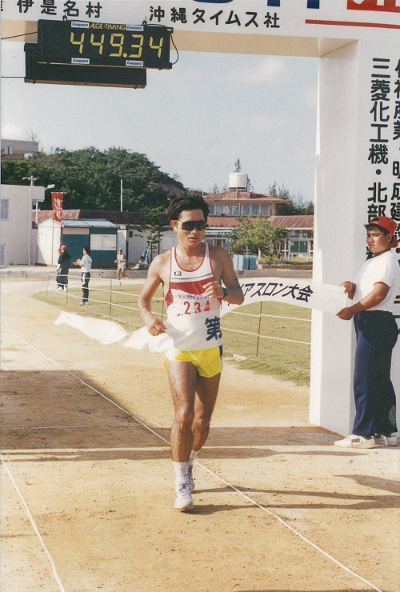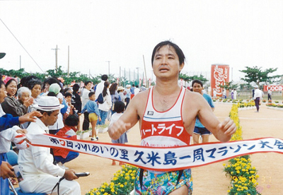 このように困った人間ですが、一端に抱負 はあります。過去に全日本宮古島トライアス ロン大 会(スイム 3km、 バ イ ク155km、ラン 42,195km)に 4 回出場し 2 勝 2 負です。還暦の 年に決着をつけようと思い、参加資格を得るた め去年の伊是名島トライアスロン大会に申し込 み、練習をしていましたが台風のため中止にな ってしまい、宮古島大会に参加申し込み出来ま せんでした。因みに第 8 回大会の最後のランは ``4 時間 15 分 `` でした。150名以上、前を行く 選手を抜きました。