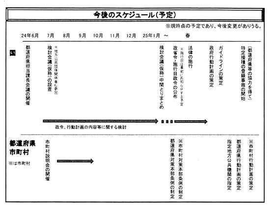 新型インフルエンザ等対策特別措置法につい ては、1)体制設備等、2)新型インフルエンザ等 緊急事態発生の際の措置が示された。(表3) また、国及び都道府県、市町村の今後のスケジ ュール案(予定)が提示された。(表4)細か い内容については内閣官房の新型インフルエンザ等対策 http://www.cas.go.jp/jp/influenza/index.html をご参照して頂きたい。