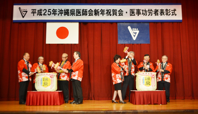 本日は、2013 年の新 春を寿ぐ沖縄県医師会 新年祝賀会並びに医事 功労者表彰式を開催い たしましたところ、仲 井眞弘多知事をはじめ、ご来賓の方々、会員並びにご家族の皆様方多数ご参加頂きまして衷心 より感謝申し上げます。