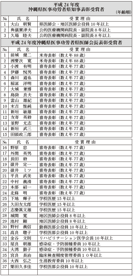 この後、引き続き行われます第27 回沖縄県 医師会医事功労者表彰式では、県知事表彰に3 名、県医師会長表彰に37 名の先生方が表彰さ れます。特に、慶祝表彰におきまして、米寿の 先生が2 名、喜寿の先生が22 名おられること は誠に喜ばしくおめでたい限りであり、沖縄県 医師会の誇りであります。受賞者の皆様におか れましては衷心よりお慶び申し上げます。現在 の本県の医療事情は国による振興計画や県の諸 施策により、大幅に改善されておりますが、そ の陰にはここにおられる先生方をはじめとする 諸先輩方が、戦後の脆弱な医療環境のもとで日 夜を分かたず保健・医療・福祉の向上確保にご 尽力いただいた基盤があったからこそ成し得た ものであり、ここに改めて先生方の永年のご労 苦に対し、深甚なる敬意と感謝の意を表する次 第であります。