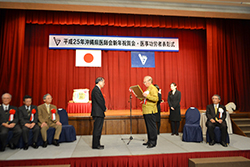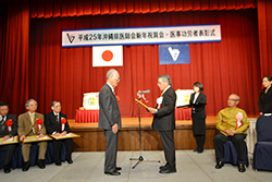 引き続き、医事功労者表彰式に移り、仲井眞 知事から沖縄県知事表彰(3 名)の授与、宮城 会長から県医師会長表彰の授与が行われた。県 医師会表彰については、受賞者が37 名と多数おられることから、ご出席頂いた先生方のお名 前をご紹介させていただき、慶祝を代表して中 村義清先生と、医事功労を代表して金谷文則先 生に授与された。その後、受賞者を代表して、 県知事表彰を受賞された大山朝賢先生から挨拶 があった。