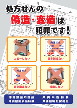 このたび、沖縄県薬剤師会が、この様な不正な処方箋偽造による不正入手が刑法違反であるというポスターを作成し、各医療機関への配布をお願いし、併せて新聞各社に対し県民への注意喚起をお願いする事と致しました。