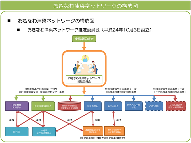 今後多くの医療機関が、おきなわ津梁ネット ワークへ参加することによって、より多くの患 者さんの検査結果が、おきなわ津梁ネットワー クで参照することができるようになり、患者さ んにとっても、参加医療機関にとっても、より 利便性の高いネットワークが構築できると考え ています。また、特定保健指導部会では患者指導用テキストやマニュアルが作成されており、 これを利用することによって、より効果的な患 者指導ができます。また今後新たに立ち上げる 健康教育・広報部会では患者さんへの指導・啓 発ツールの開発、医療機関・患者さん双方への 広報に取り組んでいく予定です。おきなわ津梁 ネットワーク参加希望の先生はP39 の参加申 請書にご記入いただき、沖縄県医師会宛にご提 出いただくか、詳しい内容につきましては、沖 縄県医師会事務局へお問い合わせ下さいますよ う、お願い申し上げます。