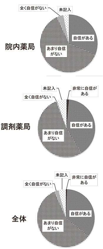 【喘息・COPD 治療の指導に自信をもってい るか】の質問に『非常に自信がある』『自身が ある』と答えたのは112 名(35.6%)であり、 病院と調剤では調剤薬局の薬剤師の方が自信を持っている傾向があった(図3)。
