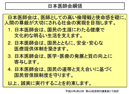昨年、会長選挙に立候補した際に、団体とし ての基礎的な考えが日本医師会定款に書いてあ るが、もっと分かり易い形で示してはどうかと いうご指摘をいただき、検討委員会を設置し、 日本医師会綱領を作成して代議員会でご承認い ただいた。