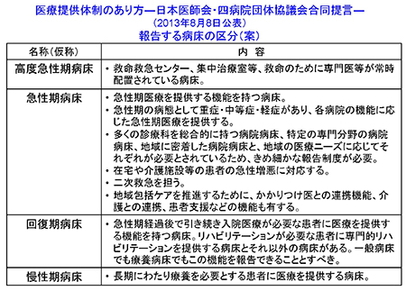 医療法等改正法案が、来年の通常国会に提出 されるようになった。一つの大きな目玉が、病 院・病床機能の分化・連携ということにある。 昨日の経済財政諮問会議中でも、地域における 医療機能の分化・連携を進めることが強く主張 されている。これは我々が先手を取ってやって いかなければならない。その他にも在宅医療、 特定機能病院の承認の更新制の導入というよう な議論がされる。