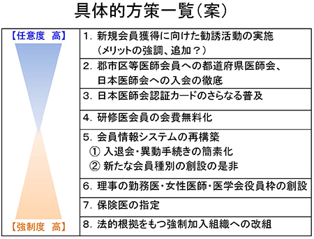医師会入会者が少ないと国に対しての発言力が低下し、影響力も低下していく。具体的な方策 として、新規会員獲得に向けた勧誘活動の実施を行い、郡市区等医師会、都道府県医師会、日本 医師会への入会の徹底を行っている。研修医会員の会費無料化等を各都道府県医師会でやってい ただいている。