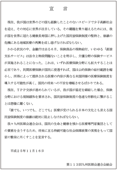 さて、現在、政府が進める経済のみに力点を おいた、TPP、国家戦略特区構想などは、医療 に市場経済主義を導入し、世界に冠たるわが国 の国民皆保険制度は形骸化する恐れがあります。