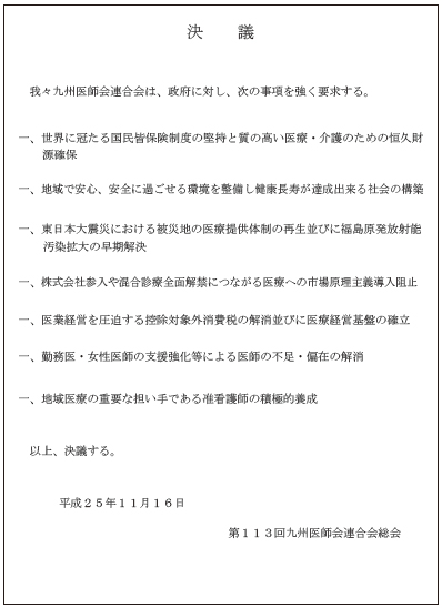 15 日には臨時委員総会があった。平成25 年4 月以降の事業の報告がなされた。また11 月まで の歳入歳出の報告があった。法人化により日医、各県の事業年度が変更になったことにより、「九 州医師会連合会会則」の改正が了承された。