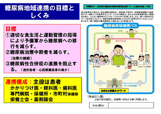 「津梁」(しんりょう)には、「架け橋」と「診療」 の二つの意味がある。ネットワークは、各医療 機関の医師、歯科医師、コメディカル、薬剤師、 栄養士、市町村担当者、国保連合会の意見や提 言をもとに、構築されている。糖尿病部会の目 的は、「糖尿病予備軍から糖尿病発症への移行 減少」(発症予防)「糖尿病治療中断者・未治療 者の減少」(治療の継続・治療へ導く)「糖尿病 性合併症の進展阻止」(透析患者・心筋梗塞患 者等の減少)である。<図1 >「おきなわ津梁ネットワーク」は、オール沖縄で取り組む地域 医療連携システムである。